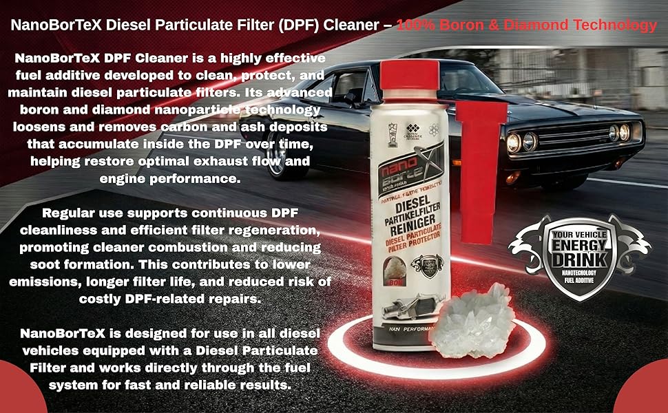 EFFICIENT NanoBorTeX dissolves stubborn carbon and ash deposits in the diesel particulate filter and protects against clogging, which allows an even and efficient combustion of the fuel and extends the life of the engine.