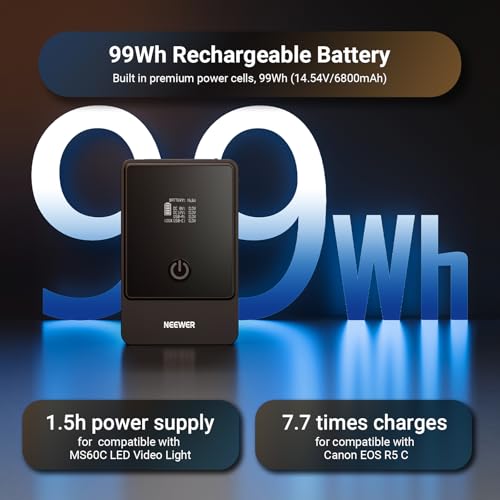 - 【6800mAh Sufficient Rechargeable Battery】 With a 6800mAh capacity (99WH/14.54V), this lithium battery provides sufficient power for extended video shooting or filmmaking. Offers 7.7 charges for compatible with Canon EOS R5 C and a 1.5h power supply for MS60C LED Video Light