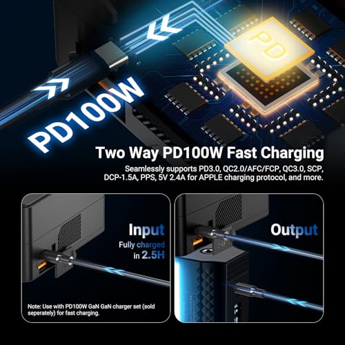 - 【Two Way PD100W Fast Charging】 Supports PD3.0, QC2.0/AFC/FCP, QC3.0, SCP, DCP-1.5A, PPS, 5V 2.4A for APPLE charging protocol, etc. With a USB C port supporting two way PD100W fast charging, the battery fully charges in 2.5h using a PD100W GaN GaN charger set (not included). Includes a D tap cable compatible with Smallrig NEEWER PS050E PS099F PS099FP PS150E V lock batteries