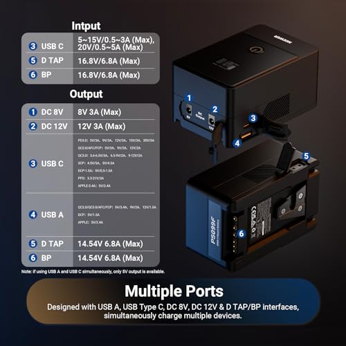 - 【99Wh V Mount Battery with Multiple Ports】 With USB A and USB C, 5.5×2.1mm DC 8V & 5.5×2.5mm DC 12V ports, BP and D Tap interfaces to simultaneously charge multiple devices like DSLR cameras Compatible with Canon Sony Nikon BMPCC 4K 6K Cinema Cameras, field monitor (NEEWER F500, compatible with Atomos Ninja v, etc), LED video lights, and V mount battery plates (ST43, PS003, PS005)