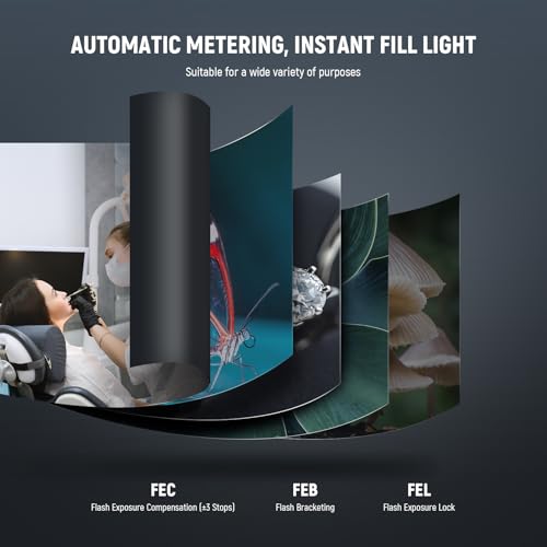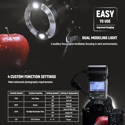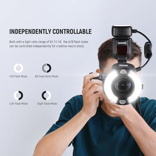- 【3 Flash Modes & Independent Flash Tubes】 TTL mode automatically gets correct exposure; M mode supports 1/1 -1/128 adjustable manual flash output; MULTI mode offers creative stroboscopic flashes. A/B flash tubes are independently and collectively controllable. In TTL/M modes, the 8:1-1:1-1:8 flash ratio is adjustable in 1/2 stops for fine tuning the image contrast. At 13oz/368g, this compact and lightweight flash ring is applicable in all situations, wide or narrow