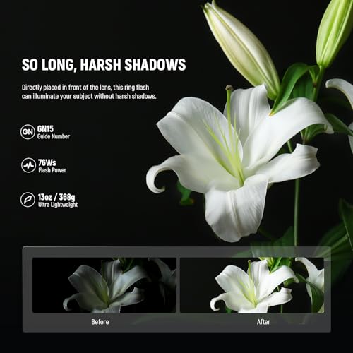 - 【Compatible with Sony Cameras】 RF1-S macro ring flash light for plants, insect photos, studio photoshoot, mini accessories, and other macro photography subjects, is for Alpha A9III A9 II a9ii A9 A7R V a7rv A7R IV a7riv A7 IV a7iv A7R III a7riii A7S III A7III A7SII A7RII A7II A7S A7 A7CII A7C A1 A6700 A6600 A6500 A6400 A6100 A6000 A99 A350 ZV-E10 zve10 ZV-E1 DSLR. 80° wide flash lighting coverage from all angles evenly brightens the subjects, minimizes harsh shadows, and avoids vignetting