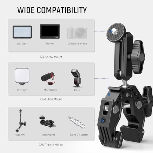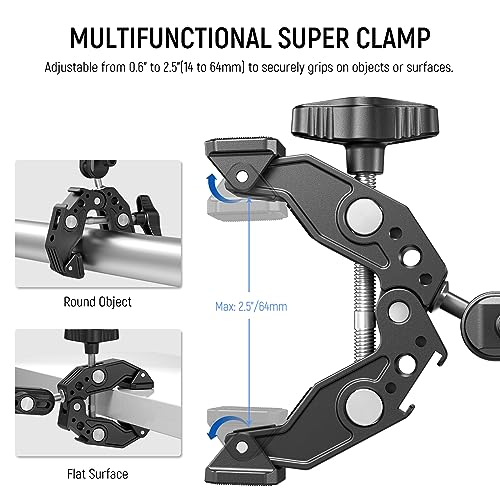 - 【Multiple Mounting Points】 With 1/4" threads for ARRI, and a built in cold shoe mount, the super clamp and magic arm with ball head can connect numerous accessories like a monitor, shoulder rig, and camera cage. The cold shoe mount for LED fill lights, microphones, and more as content creator essential and influencer must have (The maximum payload is 6.6lb/3kg. Not suitable for on camera speedlite flashes)