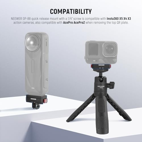【Compatibility】 NEEWER GP-88 quick release mount with a 1/4" screw is compatible with Insta360 X5 X4 X3 action cameras, also for AcePro AcePro2 when removing the top QR plate. It magnetically attaches to your camera gear without feeling its weight (only 1.16oz/33g)