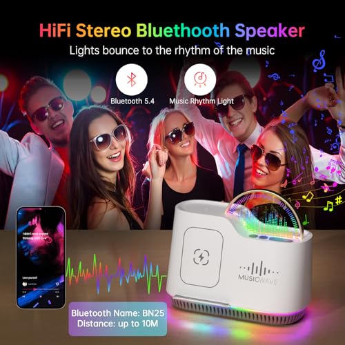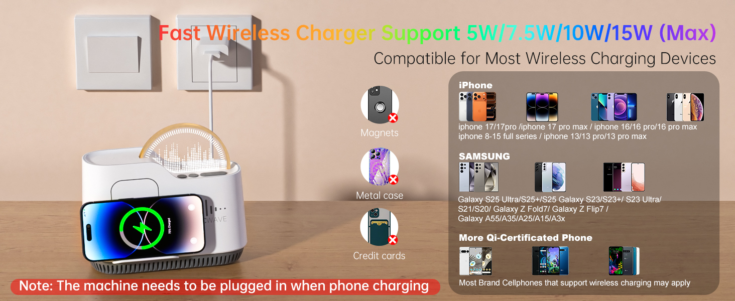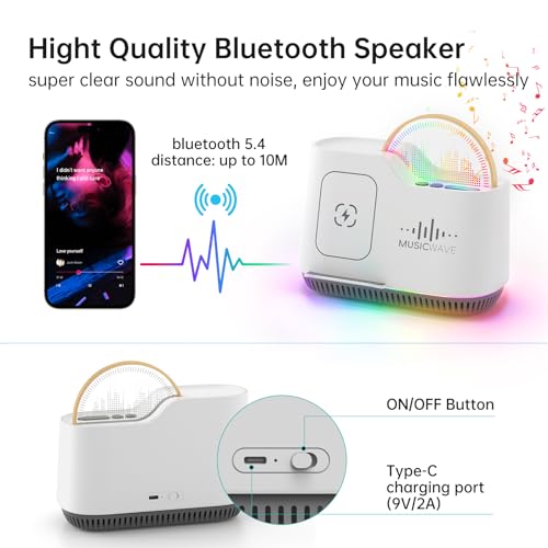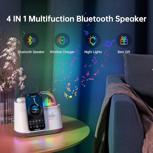 - 【 5 IN 1 Bluetooth Speaker】Bluetooth speaker + night lights + wireless charging stations +earphone charging +mobile phone holders. Its modern design and versatility make the wireless charging speaker a clean and space saving supplement to any bedside table, table, or desktop