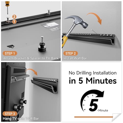 【5-Minute Easy Installation】Everything you need is included in the box of the low profile wall mount: a built-in bubble level, pre-sorted hardware, and a step-by-step guide. Even first-time installers can mount their TV in minutes with our no-damage tv mount
