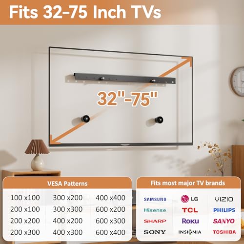 【Universal Compatibility】Anteabee universal tv wall bracket supports VESA 100x100mm to 600x400mm patterns,making it compatible with most major tv brands.This no-drill vesa wall mount is designed for 32”-75” TVs both small and large TVs, ensuring a secure load to support 68kg