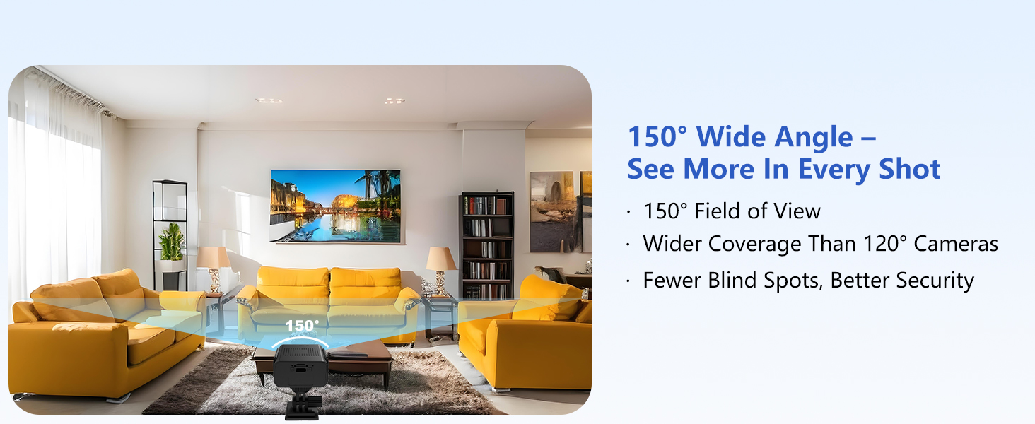 【4K Ultra HD & 150° Wide Angle】 Capture crystal-clear 4K video with this mini security camera and enjoy a wide 150° field of view, covering more area with fewer blind spots for enhanced security.