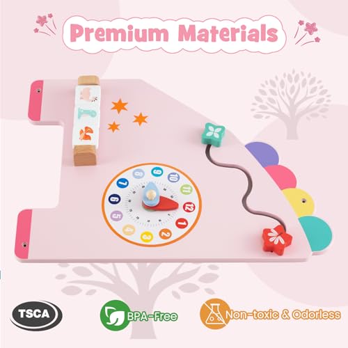 Olakids Pink Sensory Wall, 11 in 1 Wooden Montessori Busy