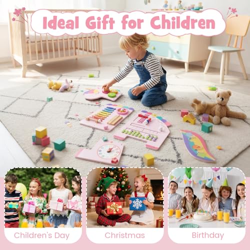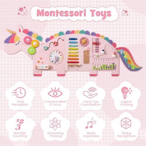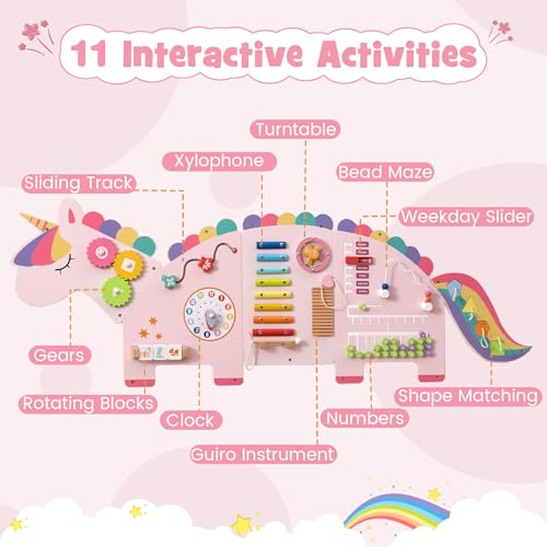 Olakids Pink Sensory Wall, 11 in 1 Wooden Montessori Busy Board Panel, Toddler Wall Mounted Activity Center, Educational Toys Learning Gift for Boys Girls (Pink Unicorn)