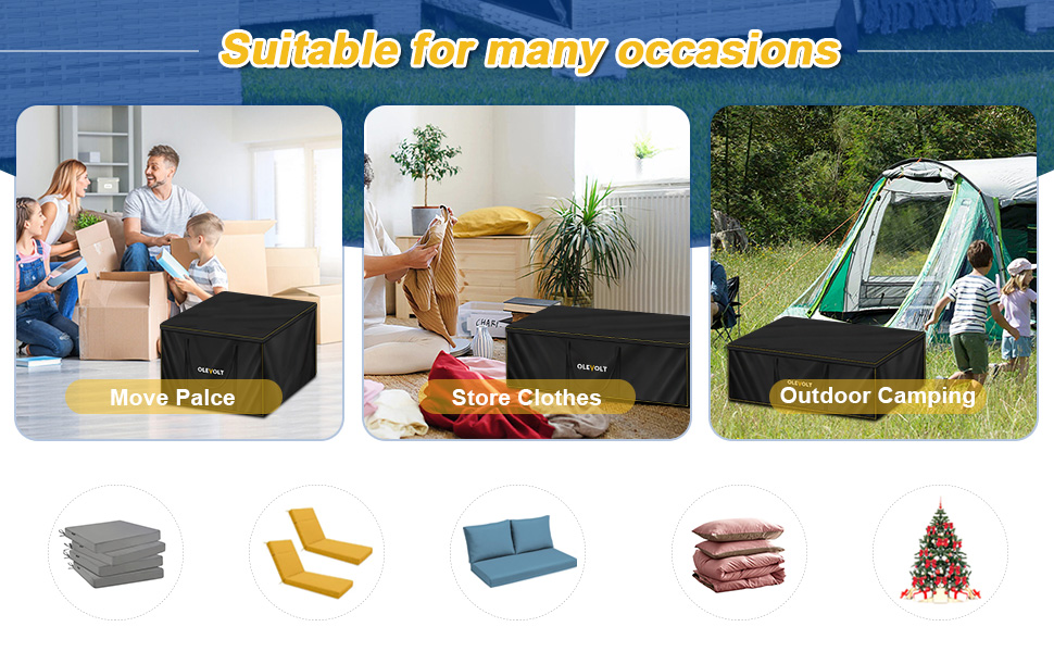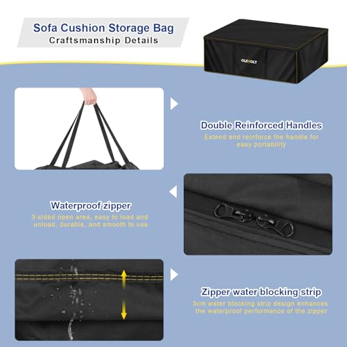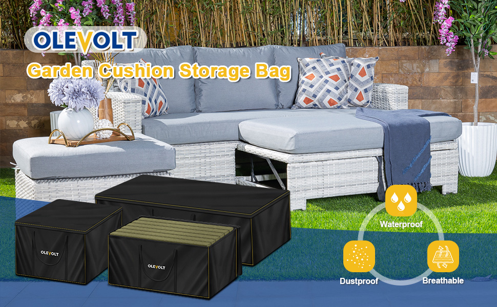- Durable Storage Bag: OLEVOLT garden furniture cushion storage bag is made of robust 600D oxford fabric, offering enhanced thickness and durability. Featuring double-stitched seams, it significantly improves tear resistance, effectively shielding against wind, sand, rain, sun, dust, dampness, and other adverse weather conditions. This protective cover provides superior safeguarding for your garden cushions and furniture, suitable for both indoor and outdoor use