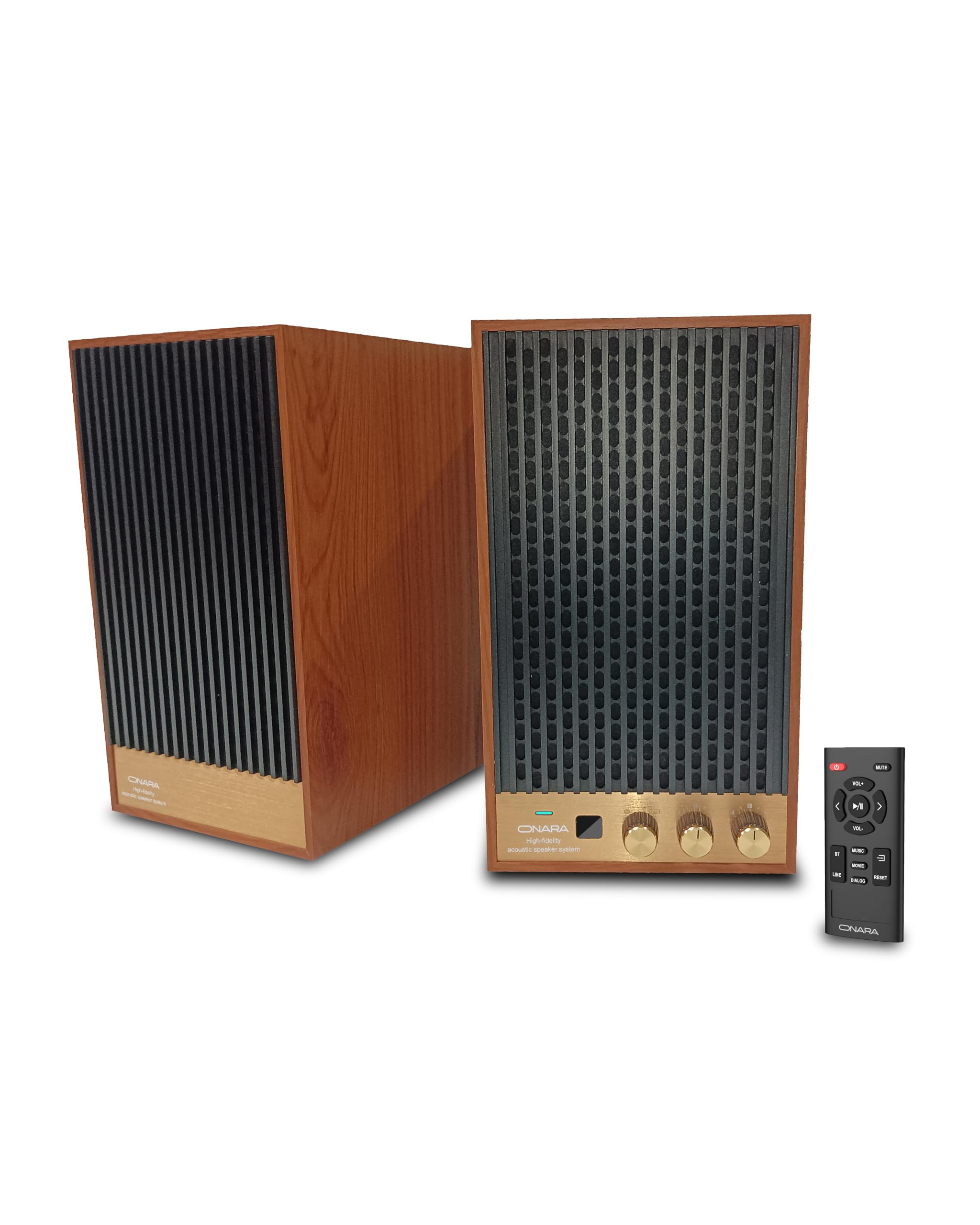 Elevate your audio experience with the Onara Wave 80s Active Bookshelf Speakers, where vintage aesthetics meet modern technology. These 60W RMS powered speakers feature an authentic retro design with a premium wooden enclosure and iconic 80s-inspired front panel. The natural wood housing delivers warm, rich acoustics that plastic speakers simply cannot match, making them ideal tv speakers or desk speakers for any setup. With versatile connectivity including Bluetooth 5.3, HDMI ARC, Optical, USB, Sub Out, and Line In, these bluetooth hifi speakers work seamlessly with your TV, turntable, or smartphone. Built-in DSP sound modes (Movie/Music/Dialog) optimize audio for any content, while the included remote provides convenient control from across the room. Your wooden bluetooth speaker arrives complete with all cables, remote with batteries, and user manual—just unbox and enjoy. Perfect for retro enthusiasts and audiophiles alike who demand exceptional sound quality with timeless style.
