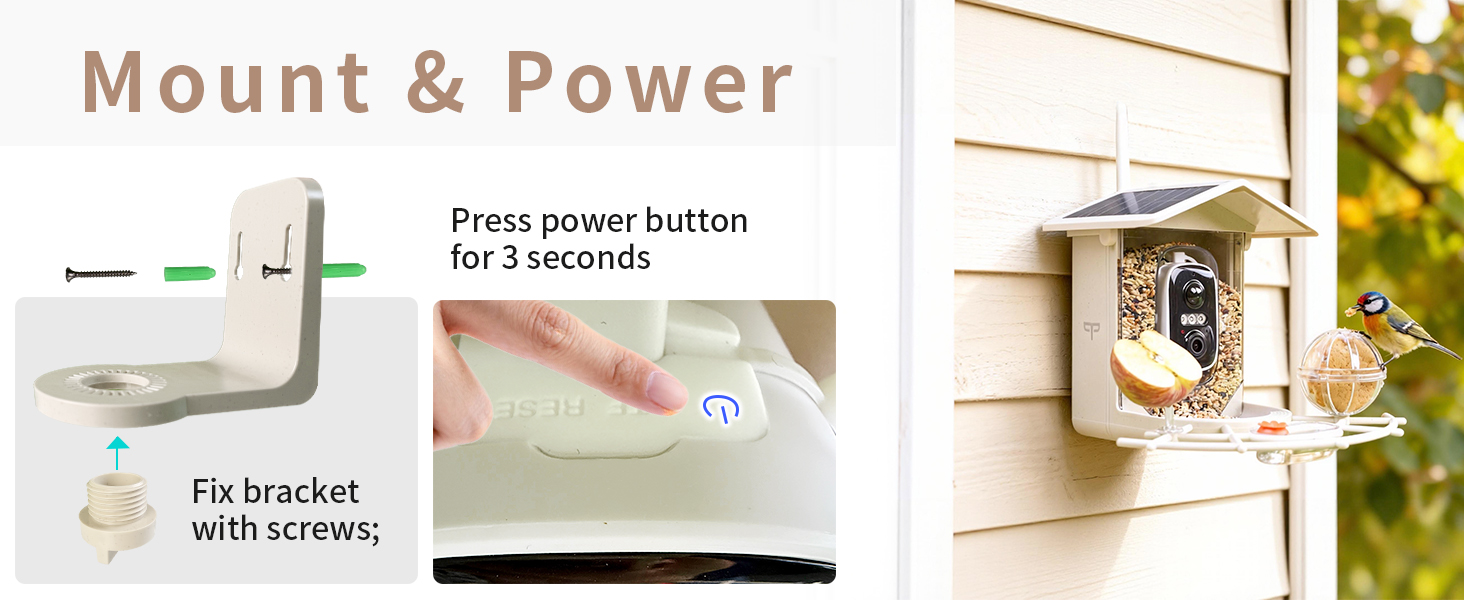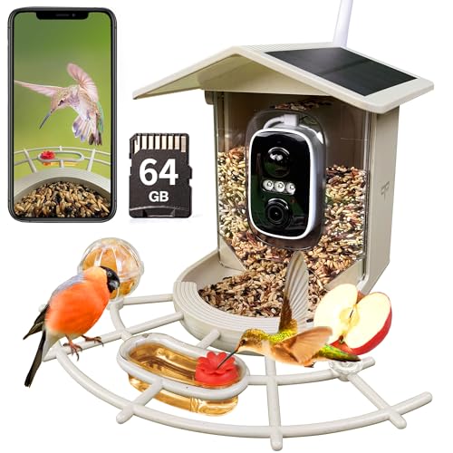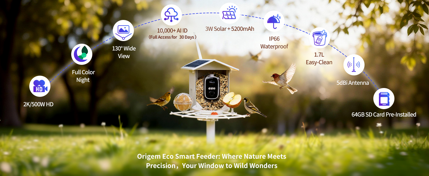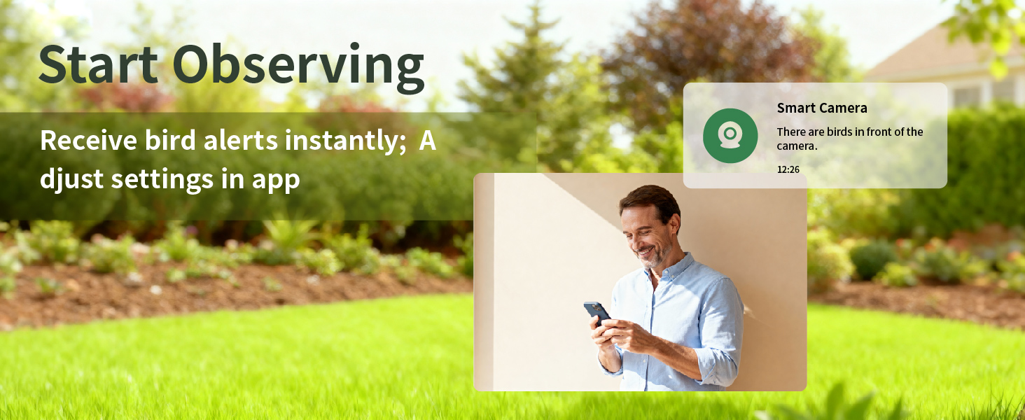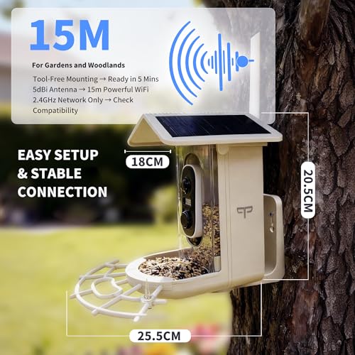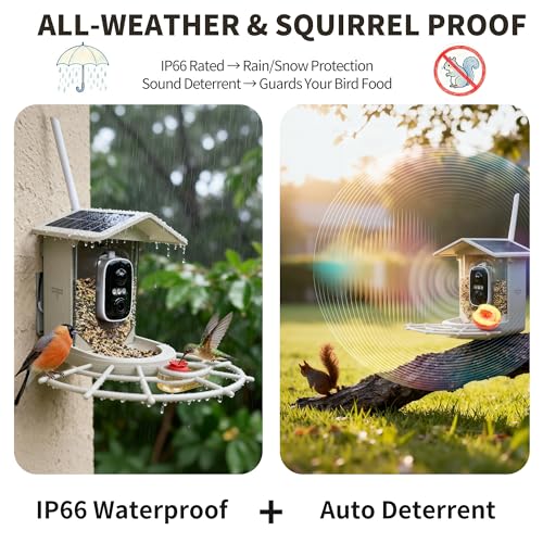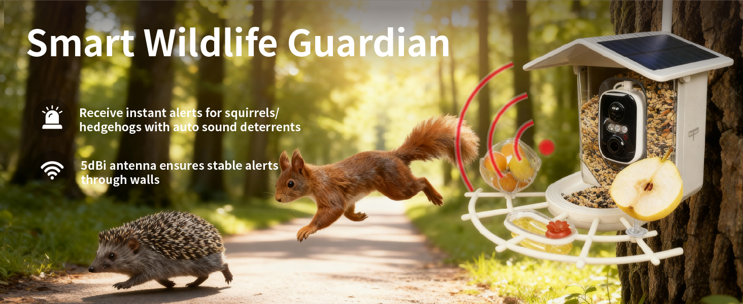 Meet Your Garden Birds: AI Identifies 10,000+ Species: Receive instant app notifications with bird names and trivia as our advanced AI accurately recognizes species (free 30-day ), while automated sound alerts scare squirrels away to protect your bird visitors,turning birdwatching into a joyful learning experience