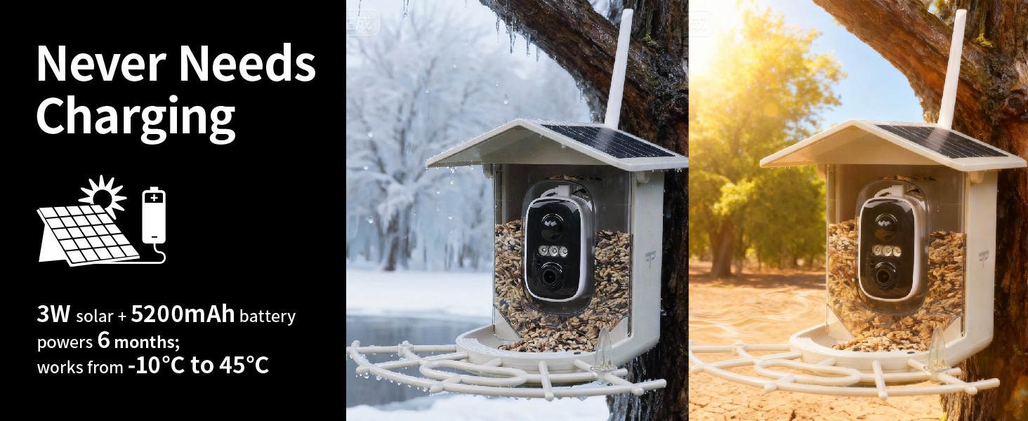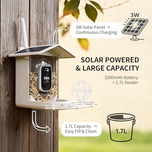 Low-Maintenance Feeding Solar Power: Refill seeds weekly, not daily thanks to the 1.7L large capacity. Enjoy zero charging worries: 3W solar panel + 5200mAh battery lasts up to 6 months