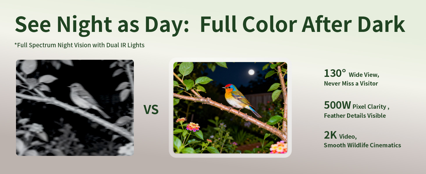 Crystal-Clear 2K Videos & 500W Pixel Photos: Never miss a feather detail with 500W pixel videos and 2K Videos with full-colour night vision across a 130° wide view—perfect for monitoring large gardens or woodland corners