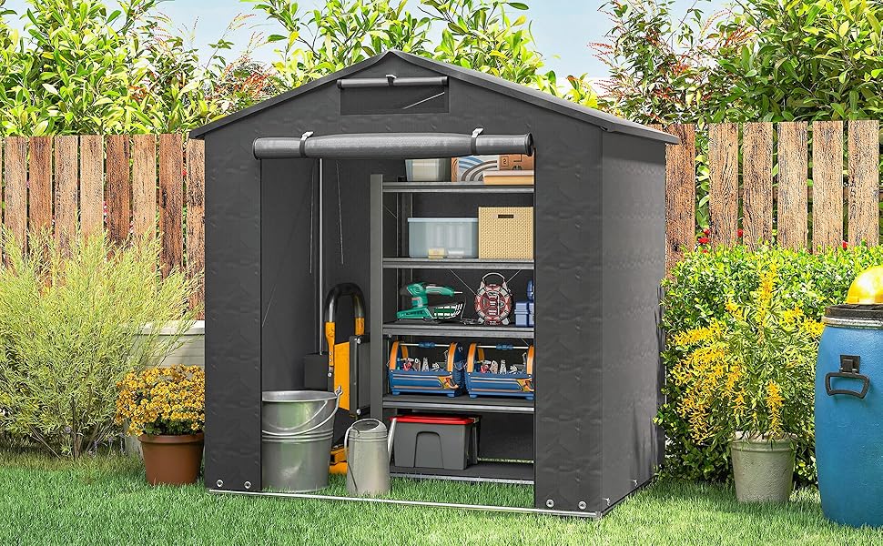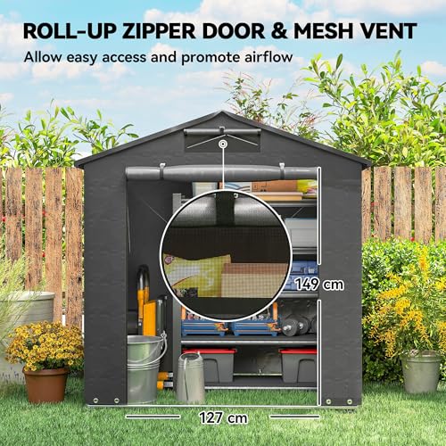 - Roll-up door & vent: Designed with a roll-up zipped door and a mesh vent for improved airflow and easy access. This portable shed allows you to roll up the door on sunny days for ventilation or close it during rain to keep your belongings protected