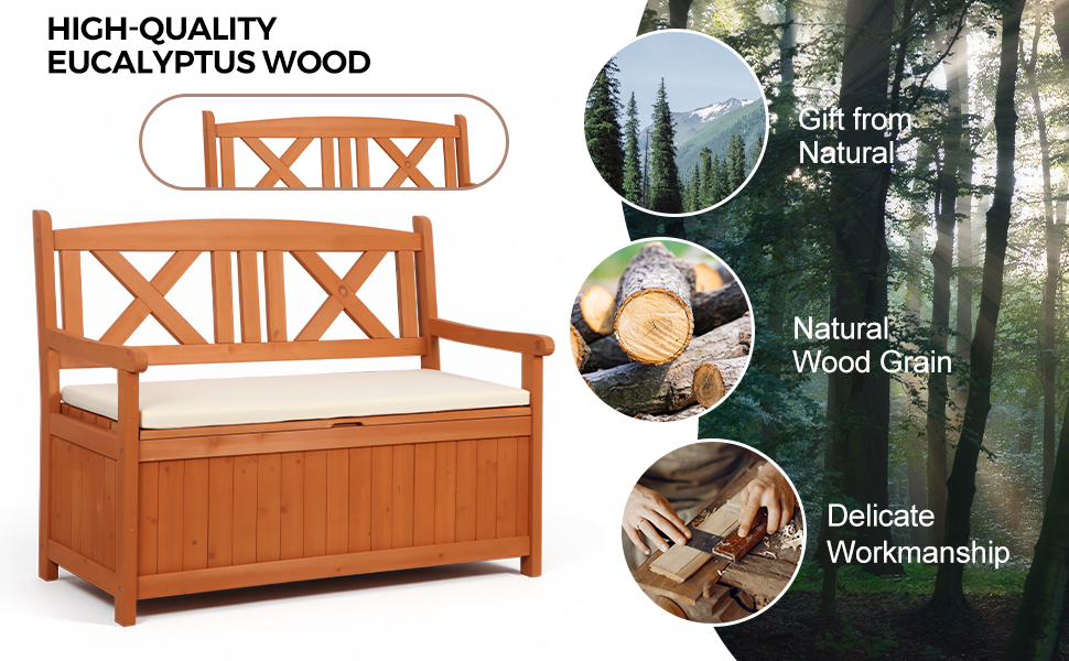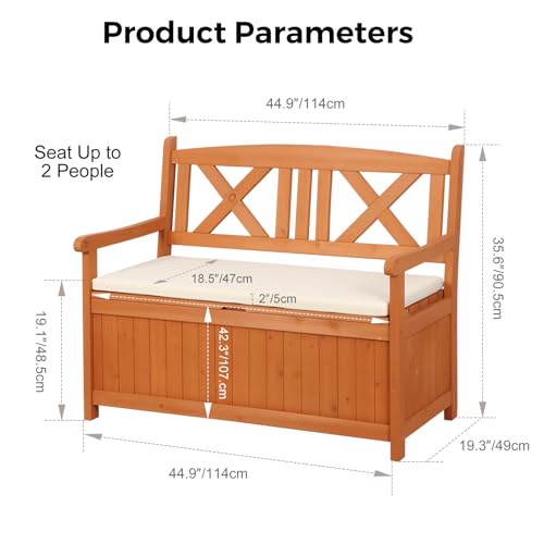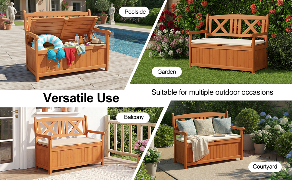 - 2-in-1 Multifunctional Bench: This storage bench not only can be used as a practical storage cabinet, but also is perfect to be a patio seat for relaxation. The wooden storage bench with cushioned is suitable for various outdoor or indoor places such as Garden, Backyard, or on the Decking. It’s an ideal Outdoor Seating solution for creating a cozy corner under your favourite tree.