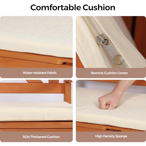 - Comfortable Slatted Design: Featuring a classic Slatted Design and a supportive back, this Wooden outdoor bench with storage is a real eye-catcher. And the seat cushions provide extraordinary comfort while relaxing in your leisure time, and shower-proof cushion covers with zipper that are washable and removable.