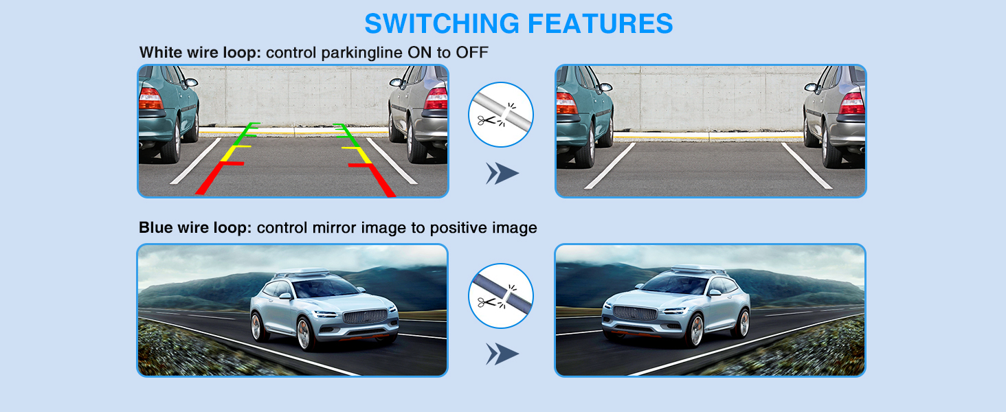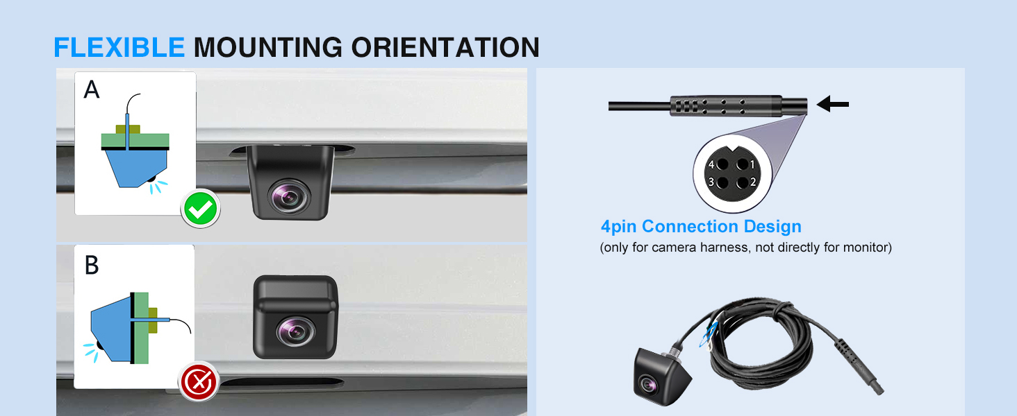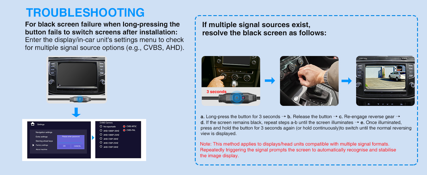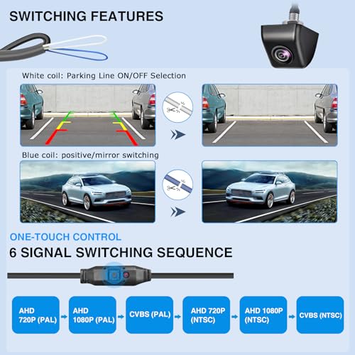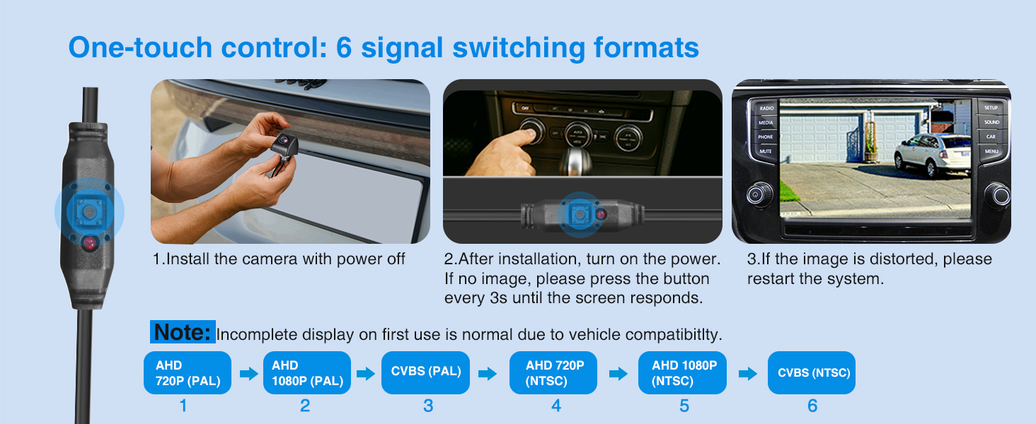 6-Mode Smart Signal Switching – Easily switch between AHD 720P/1080P (NTSC/PAL) and CVBS (NTSC/PAL) with one press. The sequence for switching between the six signal formats is: AHD 720P (PAL) → AHD 1080P (PAL)→CVBS (PAL) → AHD 720P (NTSC) → AHD 1080P (NTSC)→ CVBS (NTSC). This versatile reverse camera is compatible with car stereo displays, Apple CarPlay, standalone monitors, mirror monitors, and most OEM factory systems, ensuring seamless integration for various vehicles