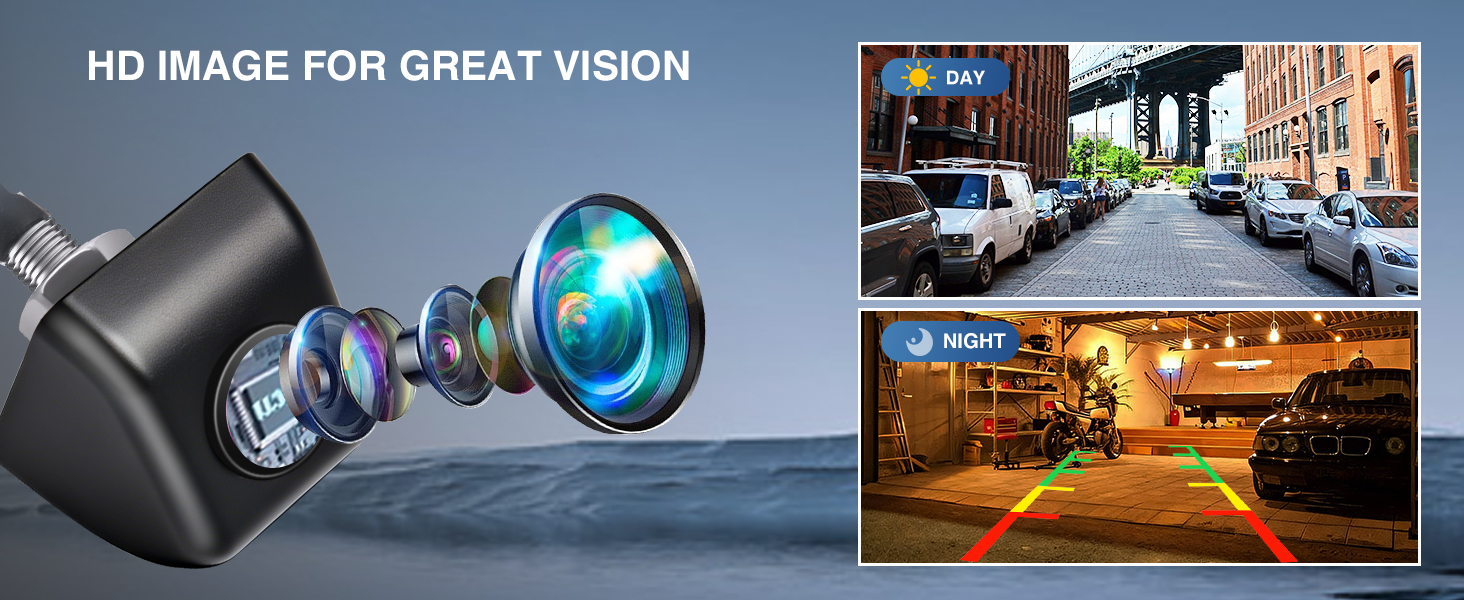 1080P HD Reversing Camera – Equipped with high-resolution 1080P imaging, the camera captures sharp, detailed visuals of the rear surroundings. Whether day or night, it delivers clear and stable backup camera views, helping you park with confidence and safety