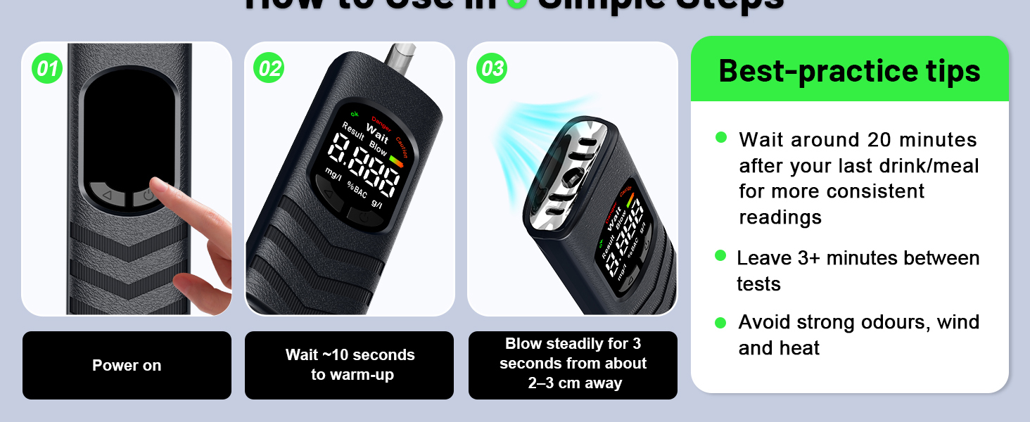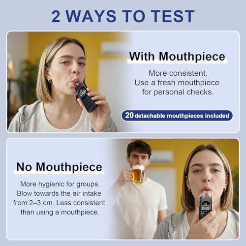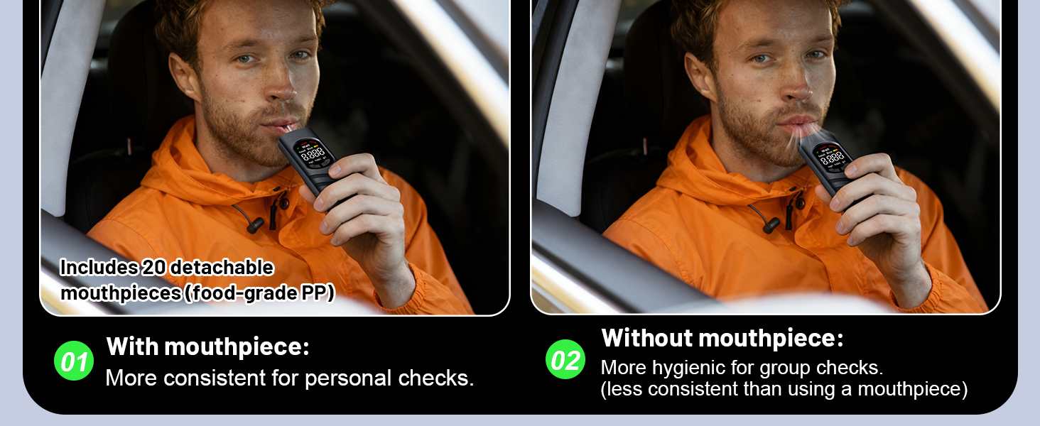 HOW TO USE & IMPORTANT NOTES – For steadier results, wait about 15–20 minutes after drinking, eating, smoking, chewing gum or using mouthwash/mint spray; fit a mouthpiece, start the device and blow steadily for the full breath; if needed, wait 2–3 minutes and repeat to compare readings; change/clean mouthpieces after use, keep the unit dry and away from extreme heat/cold. For personal reference only, not a legal or professional reading (BAC).