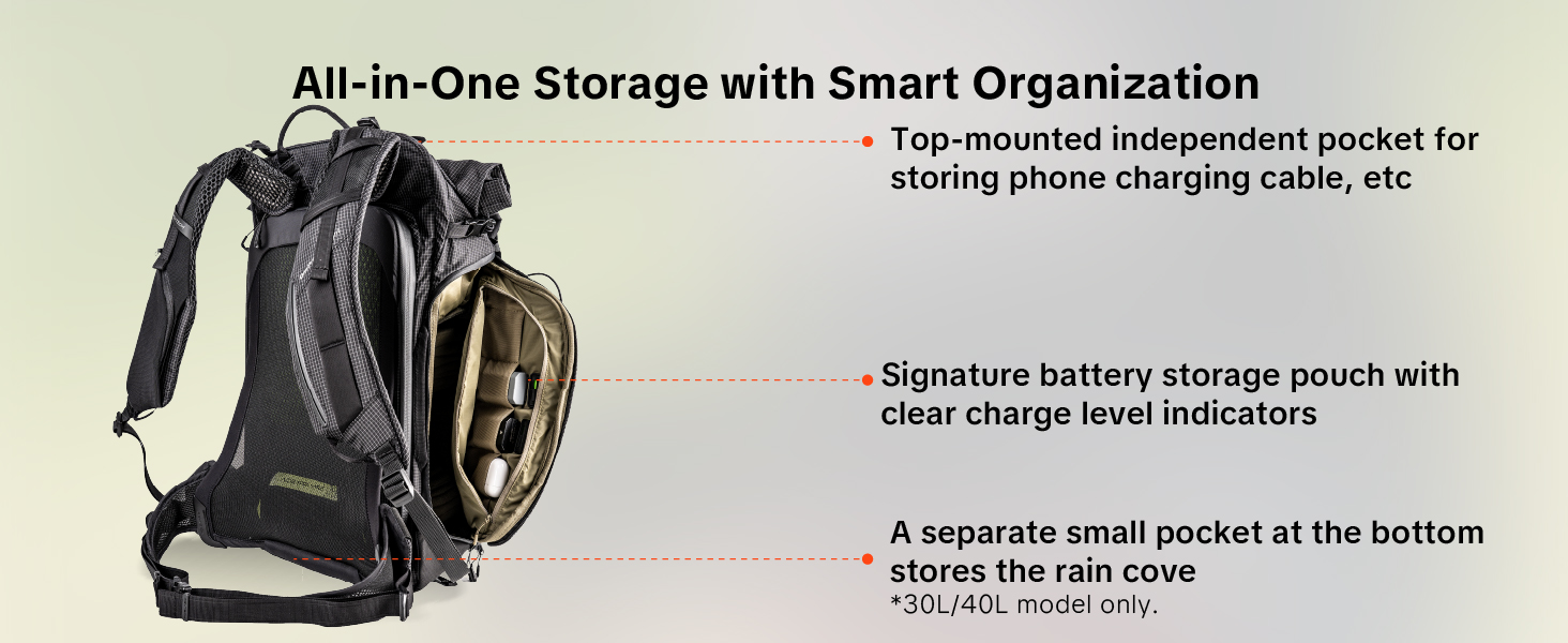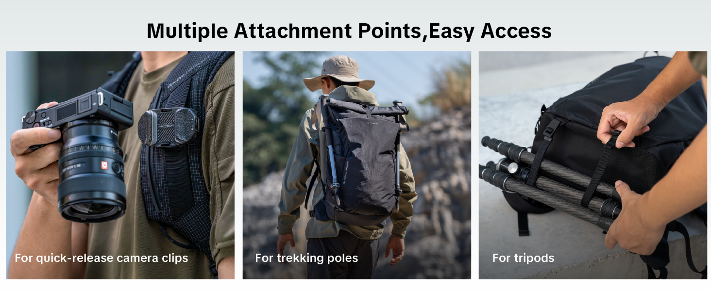 Classic large-capacity camera bag: OneMo 2/Lite; Tactical durable backpacks: OneMo TAC; Urban casual bags: OneGo Lite/2; Outdoor hiking photography bags: OnePro Flex/Focux/Ultralight; For Long-lens: OnePro ST; For Travel: Roller Backpack