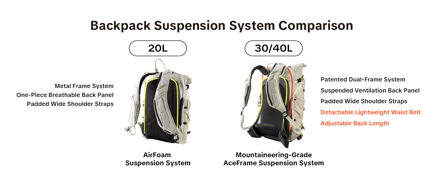 What are the differences between the 20L AirFoam suspension system and the 30L/40L AerisFrame suspension system?