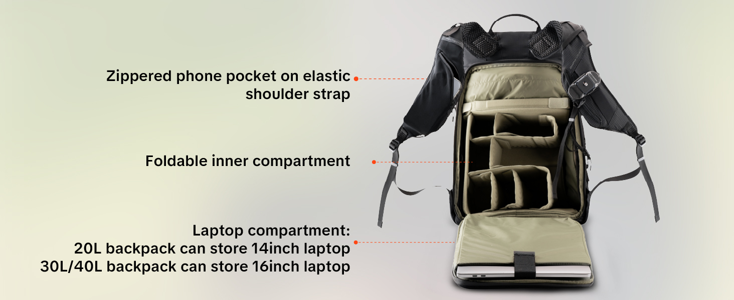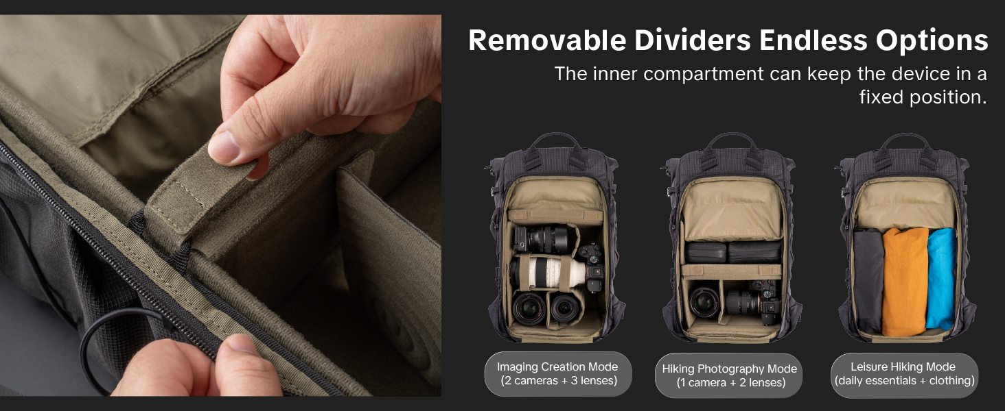 | Max.backpack's device capacity | 1 Camera+5Lenses | 3 Camera+9 Lenses | 2 Camera+11 Lenses | 2 Camera+8 Lenses(200-600mm) | 2 Camera+9 Lenses(200-600mm) | 1 Mirrorless Camera+3 Lenses |