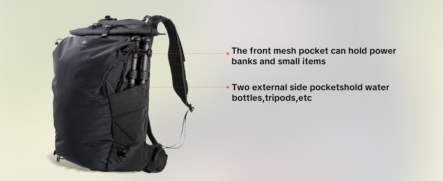 Front mesh pocket, shoulder strap phone pocket, side pockets for water bottle/tripod/rain cover (excl. 20L).