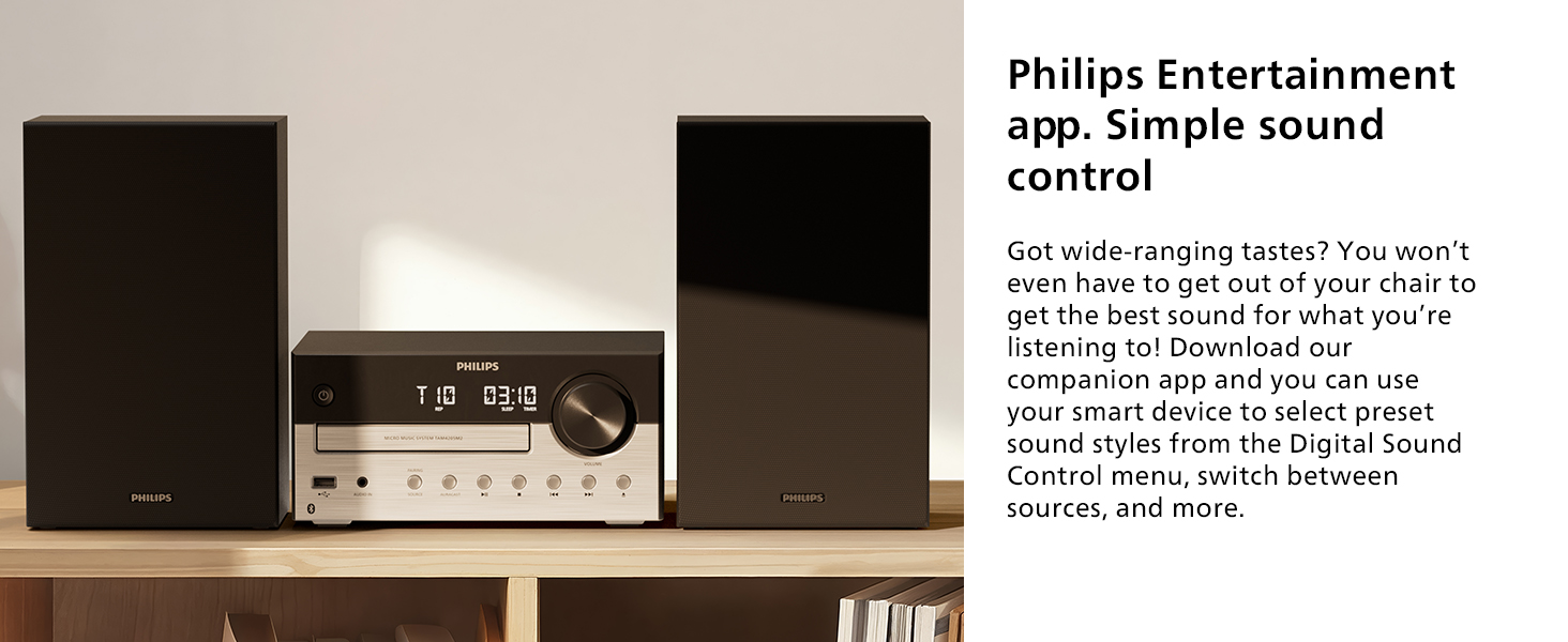 - DIGITAL SOUND CONTROL VIA APP: Use the Philips Entertainment app to select sound presets and switch between sources from your smartphone or tablet