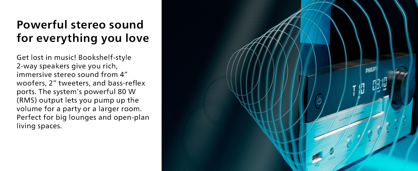 - STEREO SOUND WITH BASS REFLEX SPEAKERS: 80 W RMS output, 2-way bookshelf speakers with 4" woofers and 2" tweeters deliver balanced sound with added depth from bass reflex ports