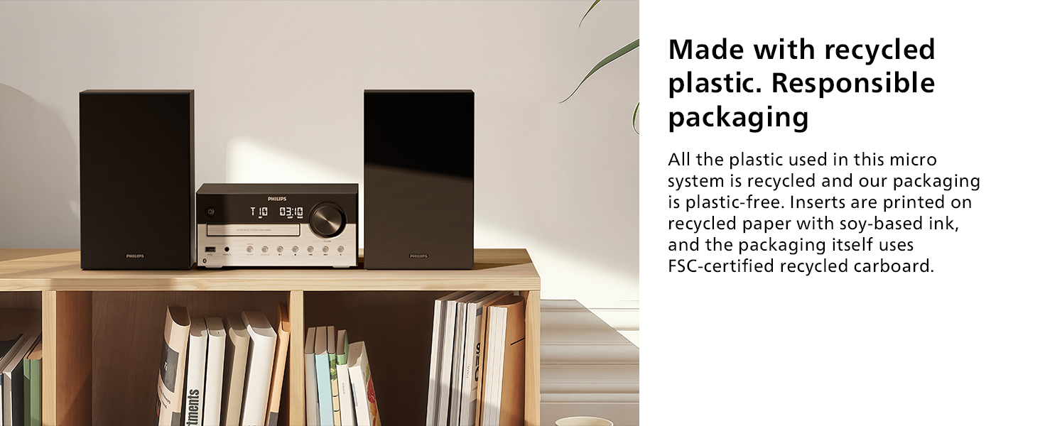 - COMPACT DESIGN WITH SUSTAINABLE MATERIALS: Classic-style micro system made with recycled plastic and plastic-free packaging. Fits easily on shelves or desktops