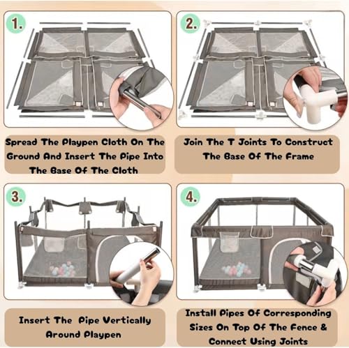 - Easy Assembly – This Playpen Features A Simple No Tool Assembly. The Durable, Metal Poles Are Hidden Away In The Cloth Of The Baby Playpen, Connected By T-Joint and Elbow Connectors.