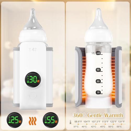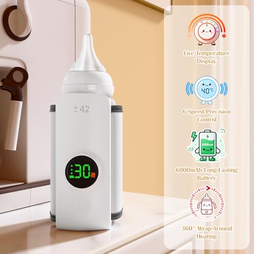 Portable Bottle Warmer with Live Display, 6-Speed Temp Control(37°C to 55°C / 98°F to 131°F), 6000mAh Battery and 360° Heating for Car, Stroller and Outdoor Use