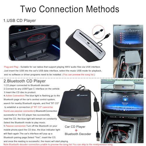 - Easy to use: Portable car CD player with Bluetooth decoder plug and play. You don't need to install any software to set the driver. It has strong error correction ability, anti-shock and noise reduction technology, low power consumption and power supply via the USB port. For some models. If they cannot recognize WAV music files via the USB connection, they can be connected to a Bluetooth decoder that can transmit data via Bluetooth, making it compatible with more. Plug and play vehicle models