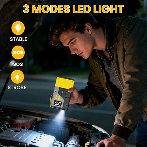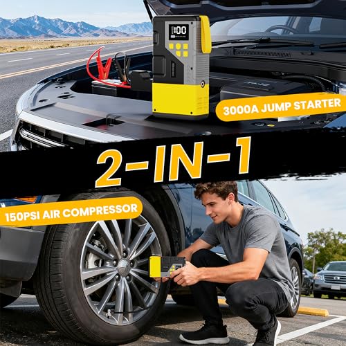 【Portable Jump Starter】 This portable car battery jump starter with air compressor,it features 3000A peak current,ideal for jump starting dead cars in no time.It’s compatible with engines up to 12L gas/10L diesel,and operates reliably in extreme temperatures from -4℉ to 140℉ (-20℃ to 60℃).It’s a must-have for road trips—it has your back when you need it most.
