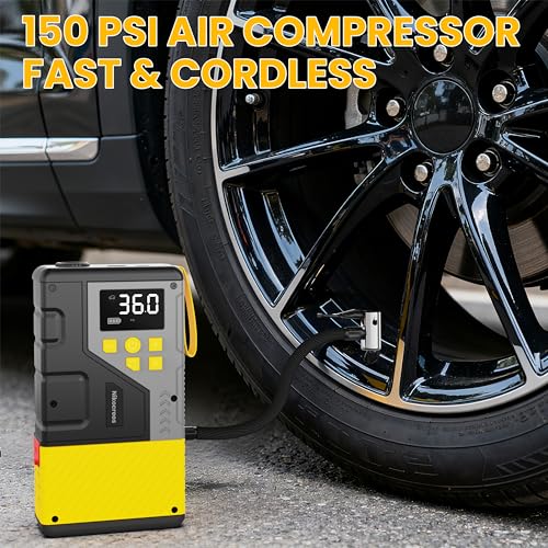 【Versatile Air Compressor】 This jump starter with air compressor has 4 inflation modes (car,motorcycle,bicycle,basketball) and 4 different nozzles,meeting different needs.It also offers 4 selectable pressure units (BAR,PSI,KPA,KG/CM²), with a maximum pressure of 150 PSI and an air flow rate of 35 L/min–its powerful inflation function fixes low tire pressure in no time.
