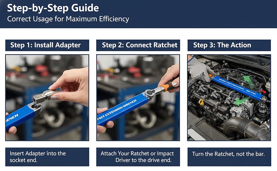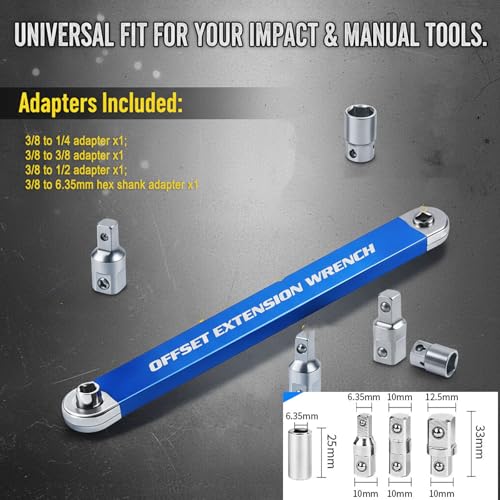 - UNIVERSAL 3-IN-1 ADAPTER SET: Includes three square drive adapters (1/4", 3/8", and 1/2") to fit your entire socket collection. Whether you are using a manual ratchet, a breaker bar, or an impact driver, this versatile extender transforms your existing tools into a precision tight-reach system.