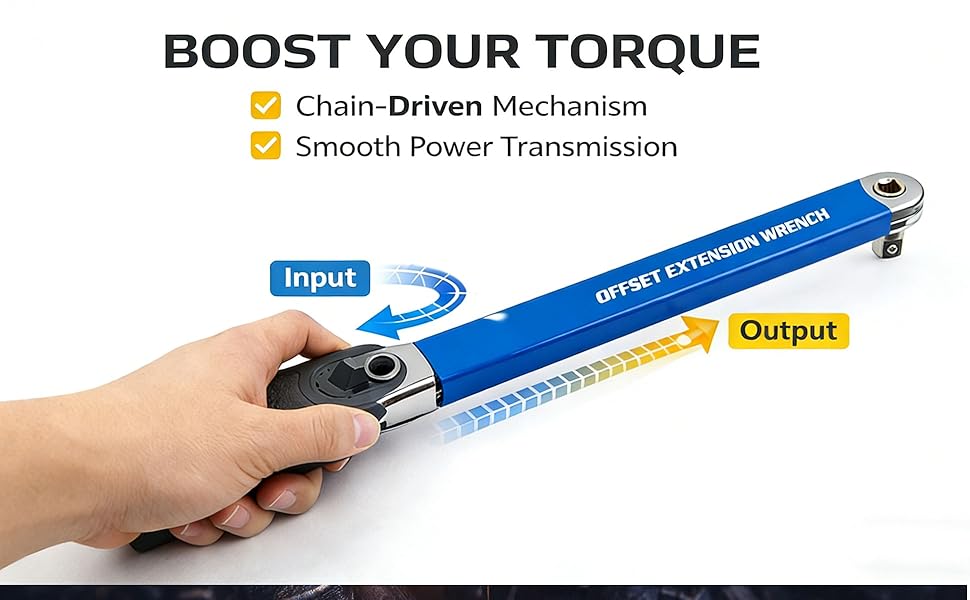 Unlike standard gear-driven alternatives that can slip or skip teeth under load, our tool utilizes a Heavy-Duty Chain Mechanism. This ensures a smooth, 1:1 torque transfer from your ratchet to the fastener with zero play. It is built to withstand up to 53 ft-lbs (72 Nm) of torque, making it tough enough for stubborn bolts yet precise enough for delicate assembly.