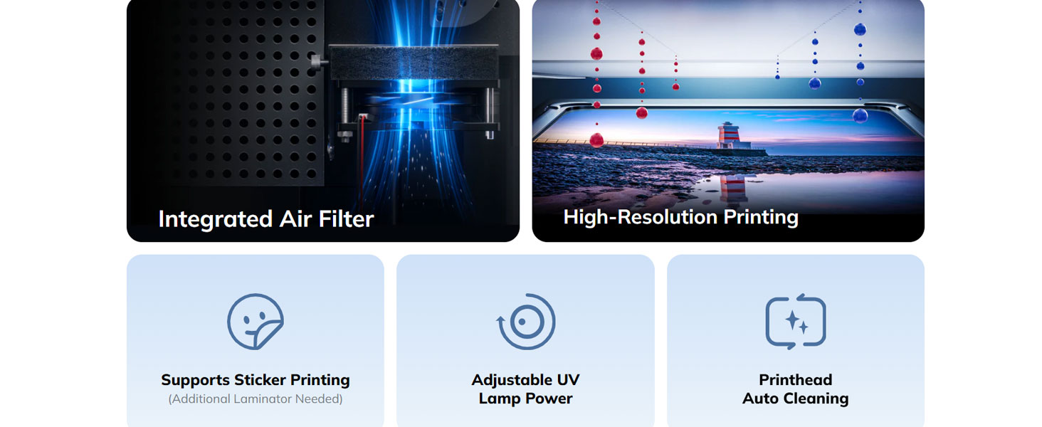 • Adjustable UV Lamp Power – Prints come out scratch-resistant and long-lasting, while the adjustable UV lamp adapts to different materials and speeds for optimal results.
