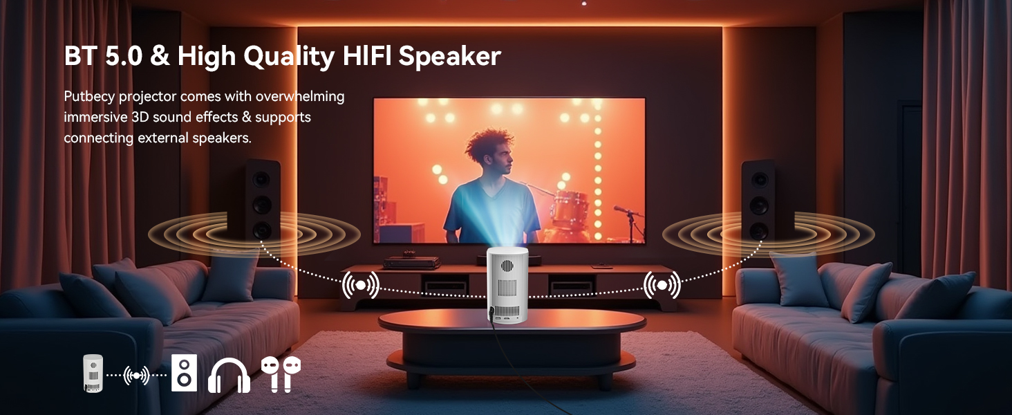 - 【Leading Edge WiFi6 & Bluetooth 5.2&3D Stereo Sound】 Putbecy WiFi projector boasts a robust 2.4G/5G dual band WiFi connection, facilitating seamless linking to your cell phone or computer, ensuring immediate and steady transmission. Putbecy movie projector is featured with 20W stereo speakers and unique sealing core technology, which can effectively reduce the noise by up to 80%, and the noise decibel is less than 20dB, allowing you to completely immerse in the 3D stereo sound environment. Putbecy Bluetooth projector can also connect external speakers through Bluetooth 5.2.