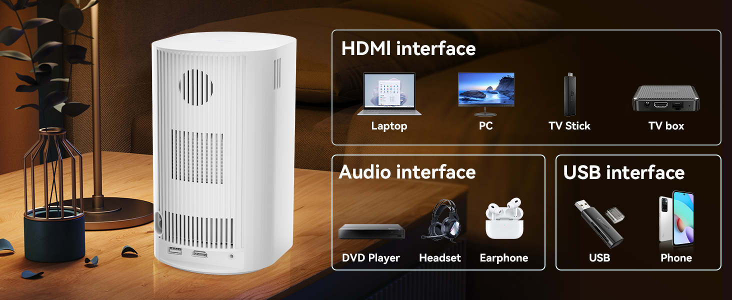 - 【Various device connections 】Putbecy TV projector comes with HDMI port, USB port and headphone jack, making it compatible with TV Stick, Laptop/PC, iPhone, Android, iPad, USB drive, Switch/Ps5 and other devices. Ideal for indoor and outdoor movies, small meetings, outdoor camping, games, parties, learning and business.