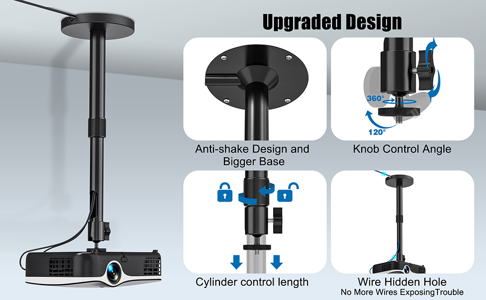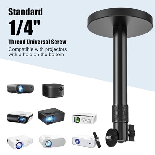 - Durable & Solid Construction – This projecyor mount is designed for wall or ceiling, anti-shake design and enlarged base with a diameter of 12cm/4.7" ensures excellent stability, providing reliable and stable projection from any angle. Also as projector stand for desk with screws mounted.