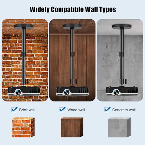 - Stable and Durable Projector Ceiling Mount – This projector ceiling mount is constructed from high-quality, thickened carbon steel for a strong load-bearing capacity. Rigorously tested, this projector stand offers exceptional weight capacity, supporting up to 11 lbs/5 kg. Its stable construction eliminates the risk of wobbling and tipping, providing reliable support for your projector. It's an ideal stand for home theaters, game rooms, and offices.