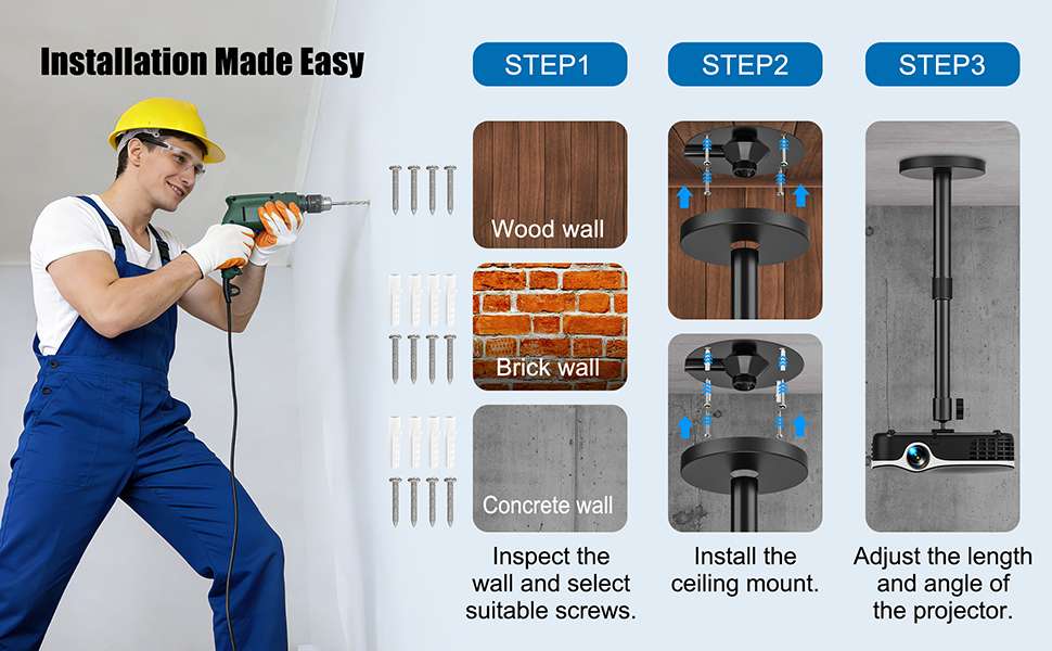 - Easy to Install – The projector stand comes with 4 screws and 4 plastic expansion plugs, you only need to drill 4 holes in the designated position of the wall or ceiling, put in the plastic expansion plugs, and then screw on the screws to complete the installation.
