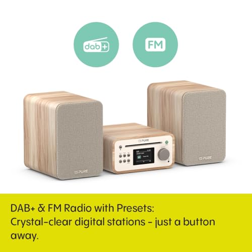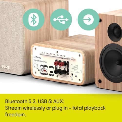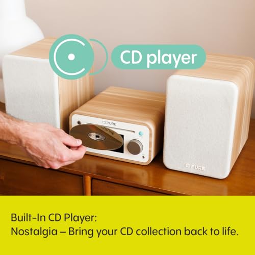 Pure Classic Stereo Mini micro hi fi system mini hifi system with CD player DAB+ & FM radio Bluetooth 5.3 USB AUX headphone jack 40W true stereo 2×20W woofers remote control – Cotton White Oak