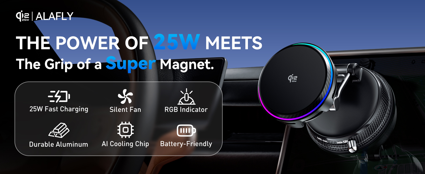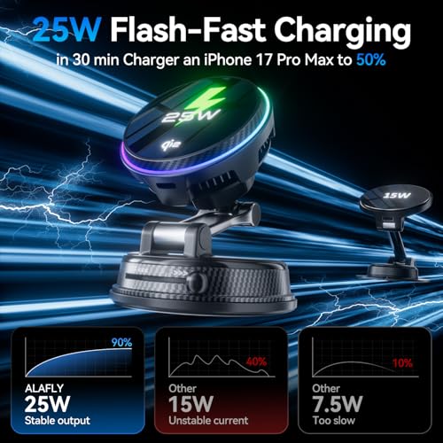 - Qi2.2 Certification: ALAFLY 25W Wireless Fast Charging Car Charger Official Qi2.2 Certified MagSafe Compatible Charger, using magnetic induction technology to achieve short-range wireless charging. It can charge an iPhone 17 Pro to 50% in just 30 minutes, providing a convenient wireless experience comparable to wired charging, and is 6 times faster than 5W wireless charging.