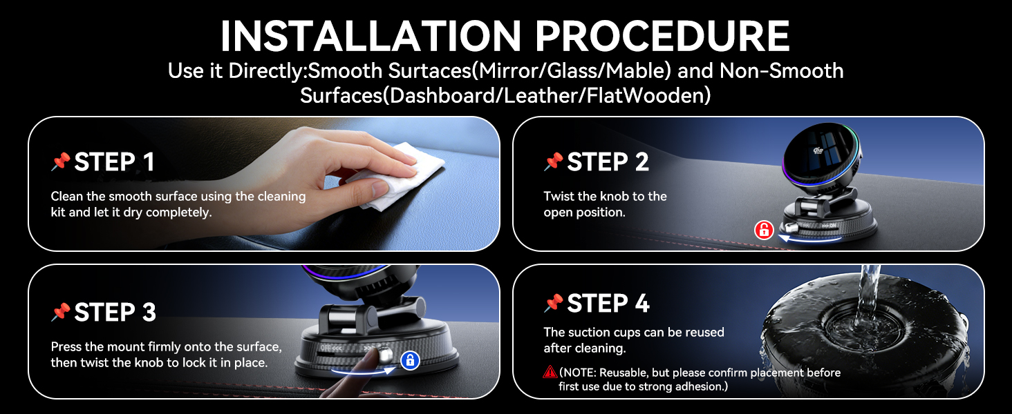 - Note 1: (1) Ensure proper installation location before use, as it is difficult to remove once installed. This is to prevent the adhesive from loosening due to adjustments. (2) Apply to a smooth car body surface if possible.