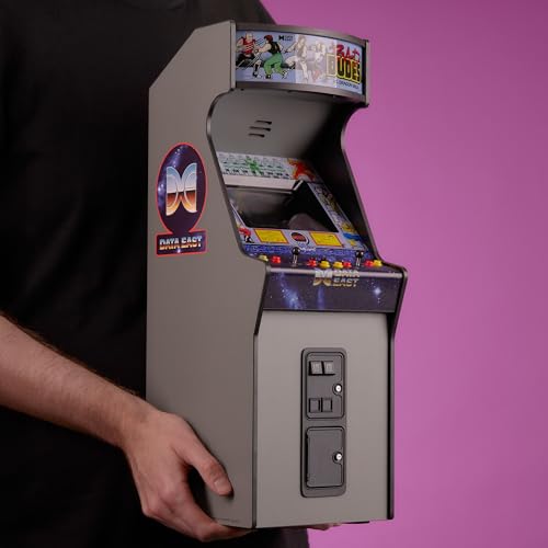 Featuring an illuminated marquee, original cabinet artwork, and real wood build, this 1/4 scale arcade is powered by USB-C and includes a rechargeable battery—ready for display, gameplay, or your retro game room centerpiece.