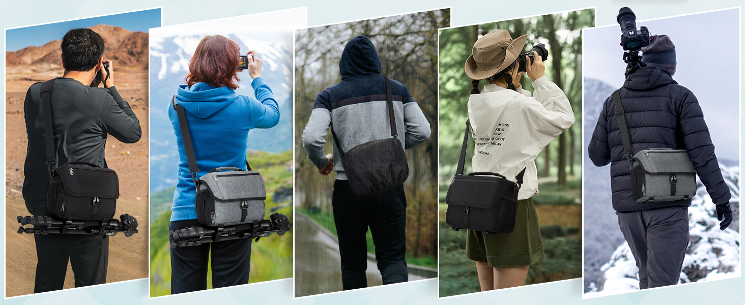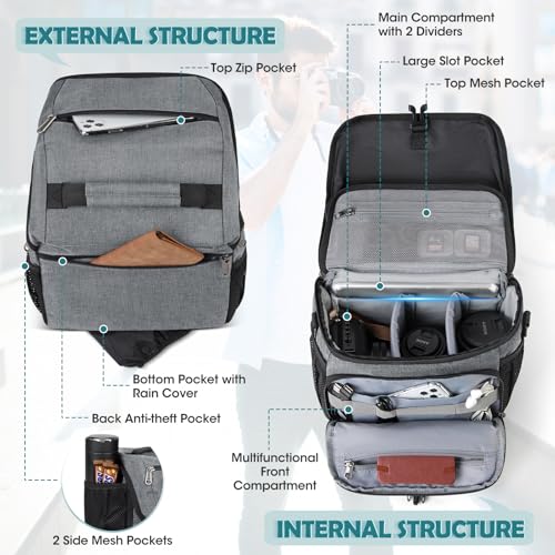 CUSTOMIZABLE & MULTIPLE STORAGE SPACE: Camera bag is divided into 2 parts storage space: External space includes a top zipper pocket, 1 back anti-theft pocket, 2 side mesh pockets and a bottom pocket with rain cover. Internal space includes 1main compartment, 1 top mesh pocket, 1 large slot pocket and 1 multifunctional front compartment. Main Compartment with 2 removable dividers gives excellent customizable and protective internal space to fit various camera sizes.